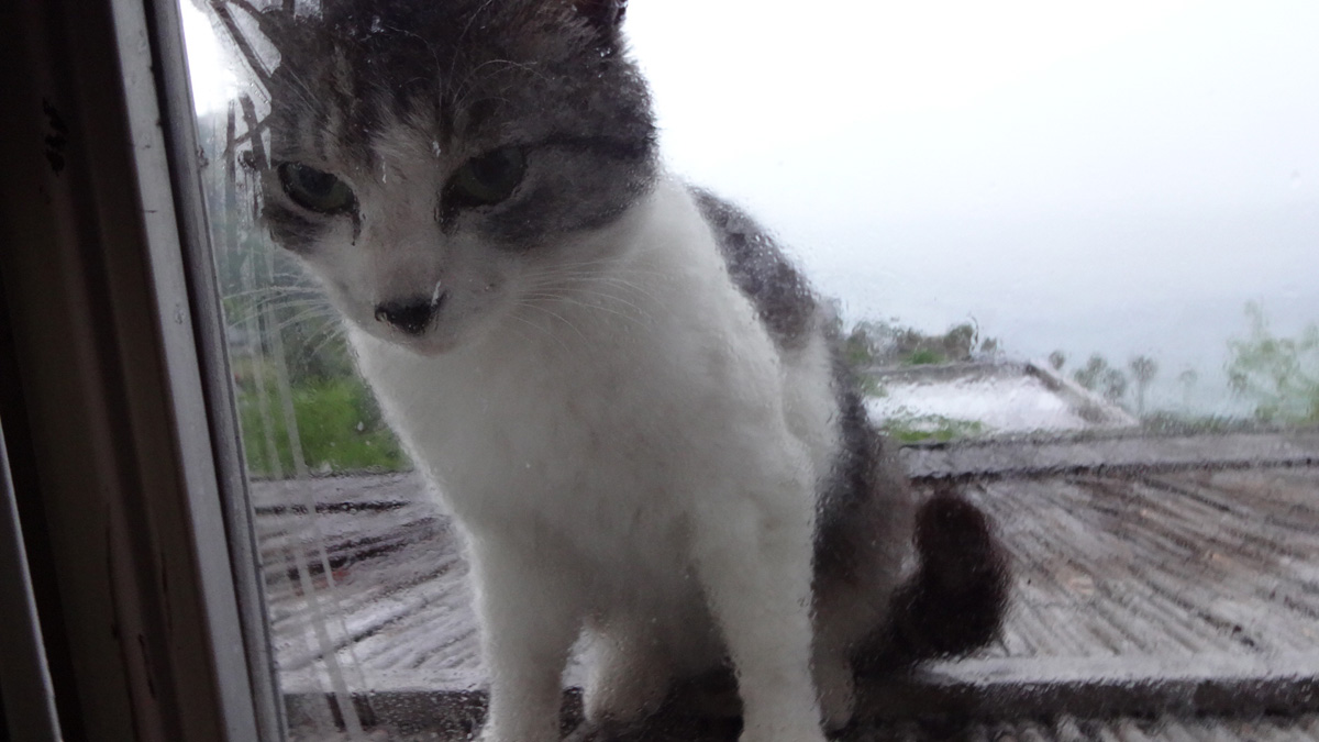 宿泊先のホテルでのんびりと食事中、窓の外に猫様登場。