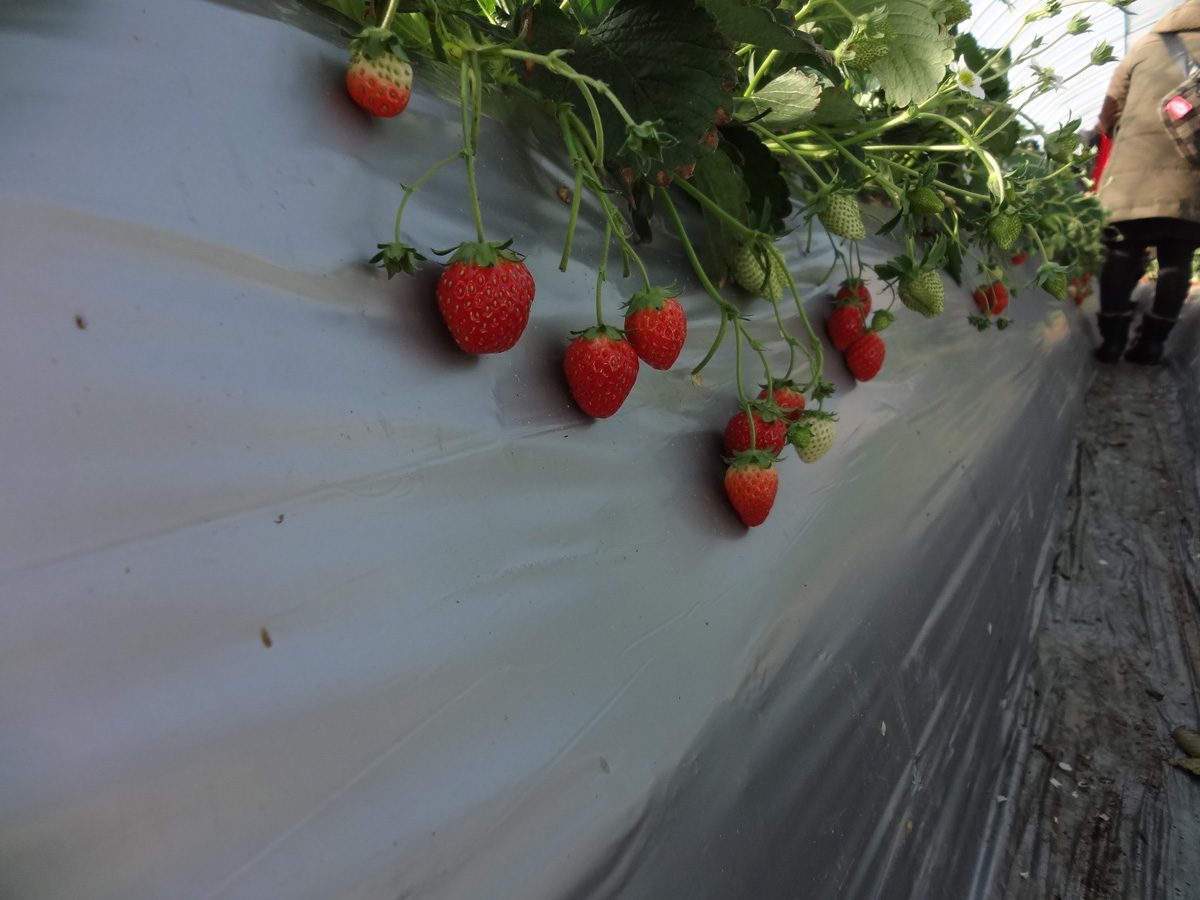 ここがイチゴ農園 ビニールハウスの中はむっとするぐらい暑いのよ