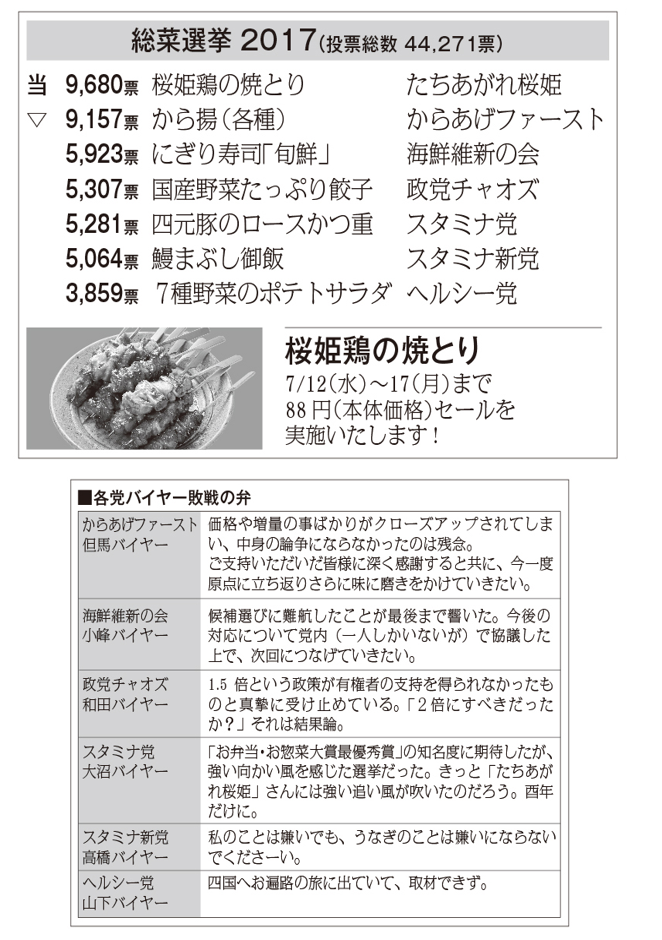 総菜選挙 7月 24, 2017 んあ?総菜選挙?何じゃそれは 桑野バイヤー?一体誰じゃ なるほど、スーパーマーケットのサミットストアでそんな企画をやっていたのか ほほほほほ、わらわが桜姫ぞよ おお、あんたが桜姫か!って知らんがな 関連