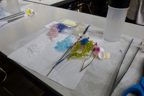材料はプリザーブドフラワーやドライフラワー、砂や貝殻など乾燥した物になります