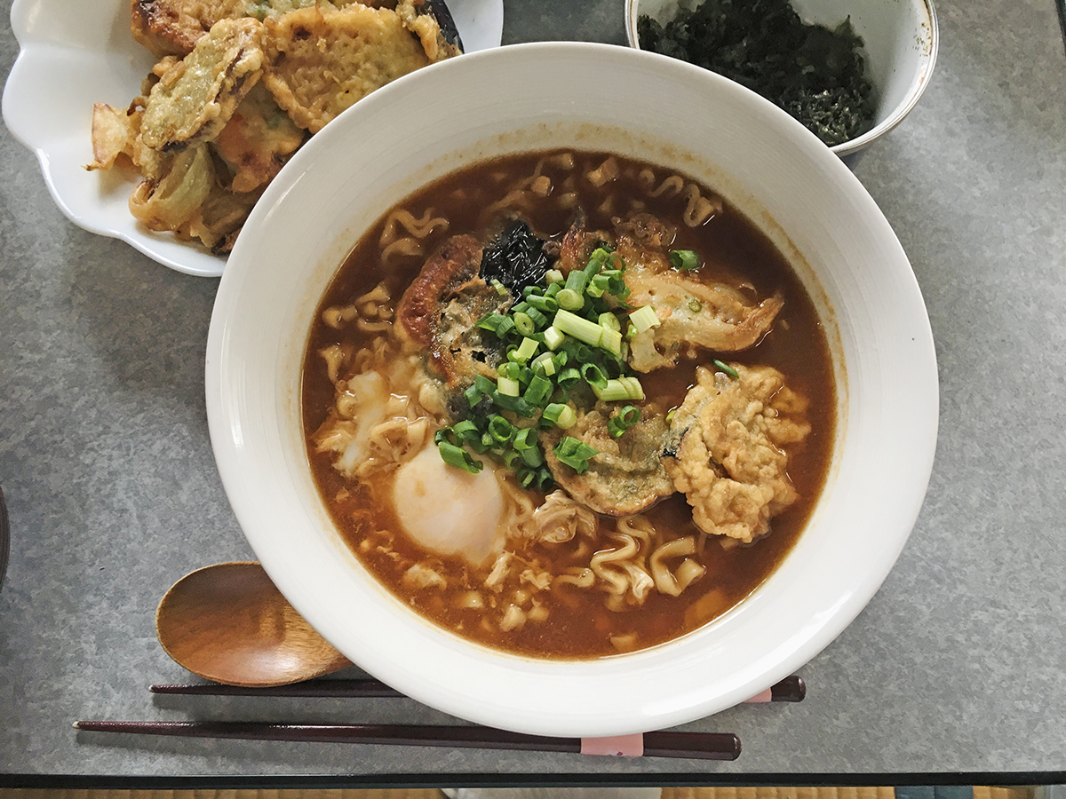 前日の残りの天ぷらを乗せて、小ネギを散らして、海苔も散らして食べました。